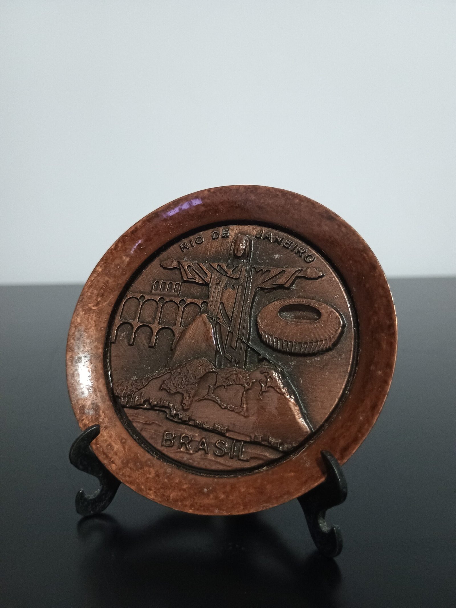 Prato pequeno em metal tipo bronze do Rio de Janeiro com Cristo, Pão de açucar, Maracanã e Arcos da Lapa